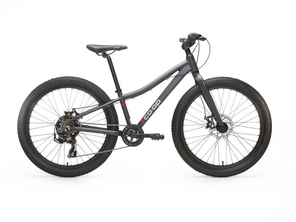For young cyclists ready to build skills on singletrack, the Co-op Cycles REV 24 bike provides reassuring traction and control with plus-size tires and 1×7 shifting to keep the ride light and simple.
